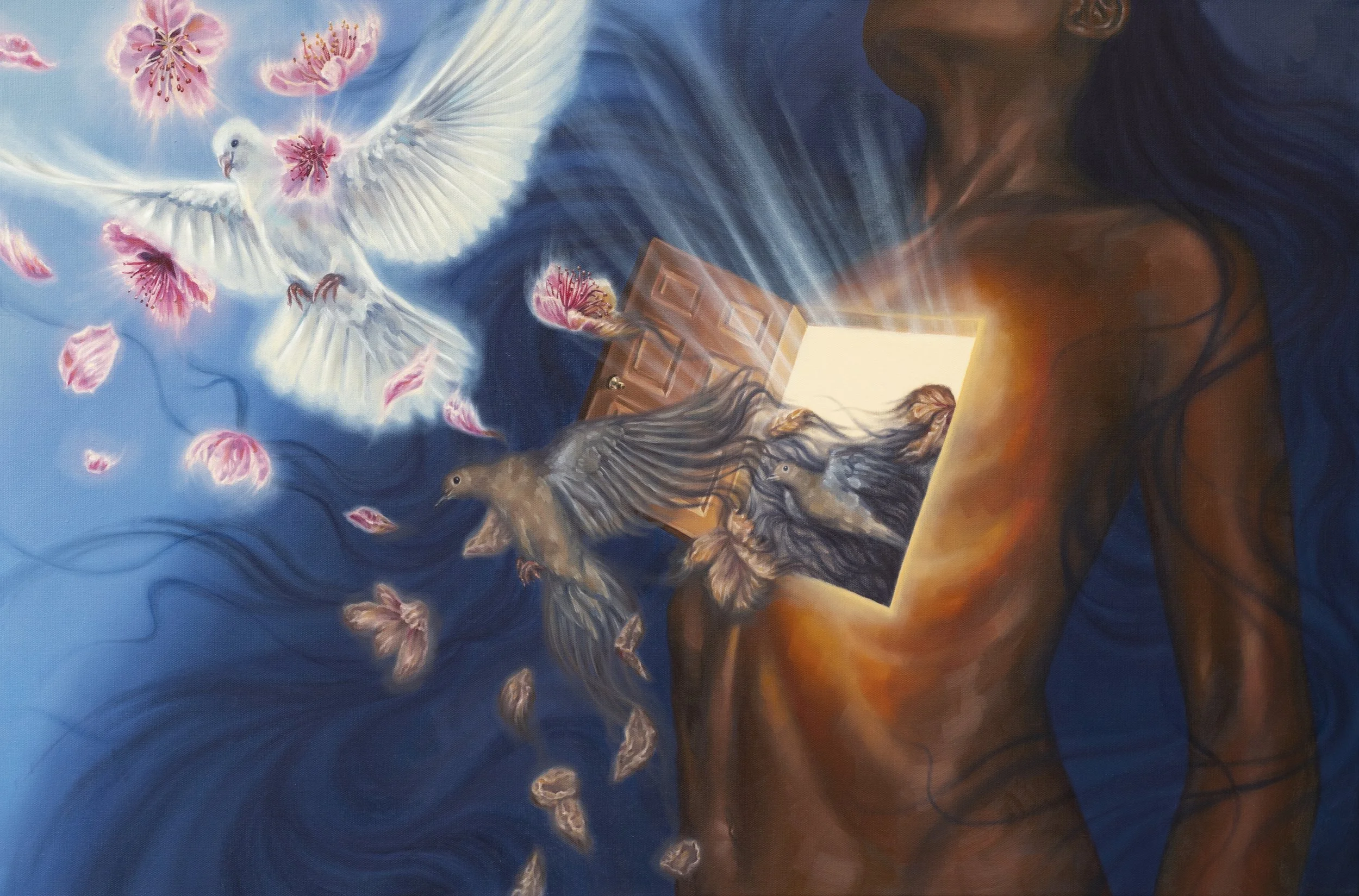 Forgiving is hard – even when you truly want to. The process is riddled with bitterness, loss, and risk, but also promises potential healing and new beginnings. Opposing forces compete in this painting: luminosity and shadow, serenity and grief, flourishing and withering, redemption and regression. A soaring white dove is shadowed by its darker inverse, mourning doves. Píng guǒ huā (apple blossoms) are symbols of peace and healing, used in traditional Chinese medicine to restore balance in the body. Across the canvas, they atrophy, sink, and dissipate into wisps of shadow, or float in full bloom, emitting rays of light like little suns. The journey of forgiveness is fraught, protracted, and far from linear. But trying to forgive is often the first step toward dispelling ghosts of the past and healing from personal and collective trauma.