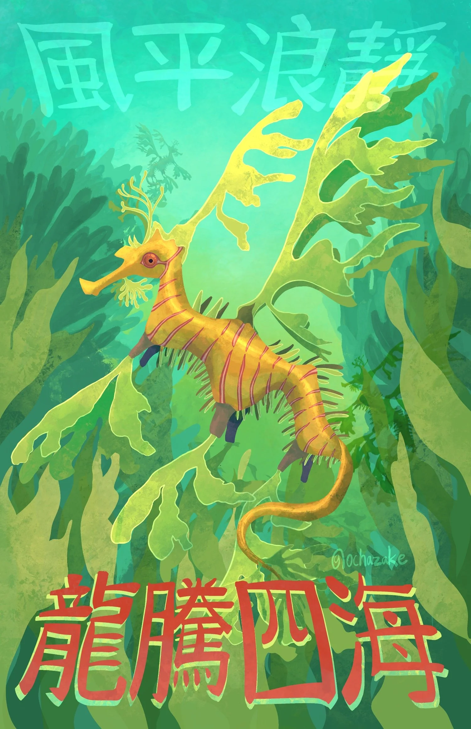 I created this piece to commemorate the Year of the Dragon in early 2024. 龍騰四海 is a traditional blessing meaning "the dragon conquers the four seas", while 風平浪靜 means "the wind is calm, and the seas are quiet". The "dragon" in the painting is a leafy sea dragon - a real animal found in the Pacific Ocean, around Southern Australia. I chose to represent a dragon with a real world animal to highlight what a biodiverse world we live in. I feel like the two idioms in Chinese also represent the tranquility and strength of a coral reef.