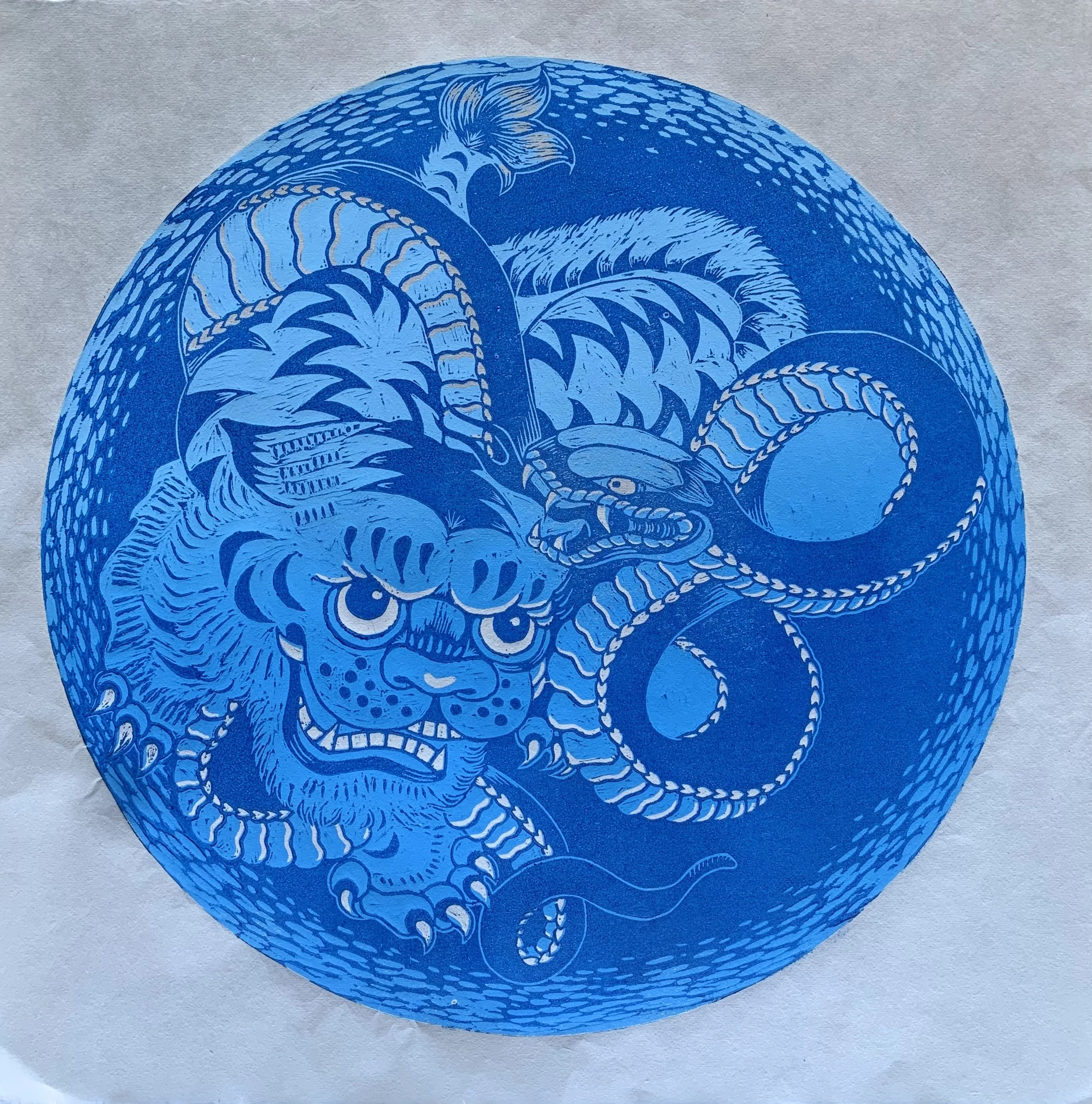 “Battle Royale” is a play on a classic, Western tattoo design that depicts two animals of power interlocked in combat, and I chose to use imagery inspired by Chinese guardian lions and Japanese tebori-style snakes.