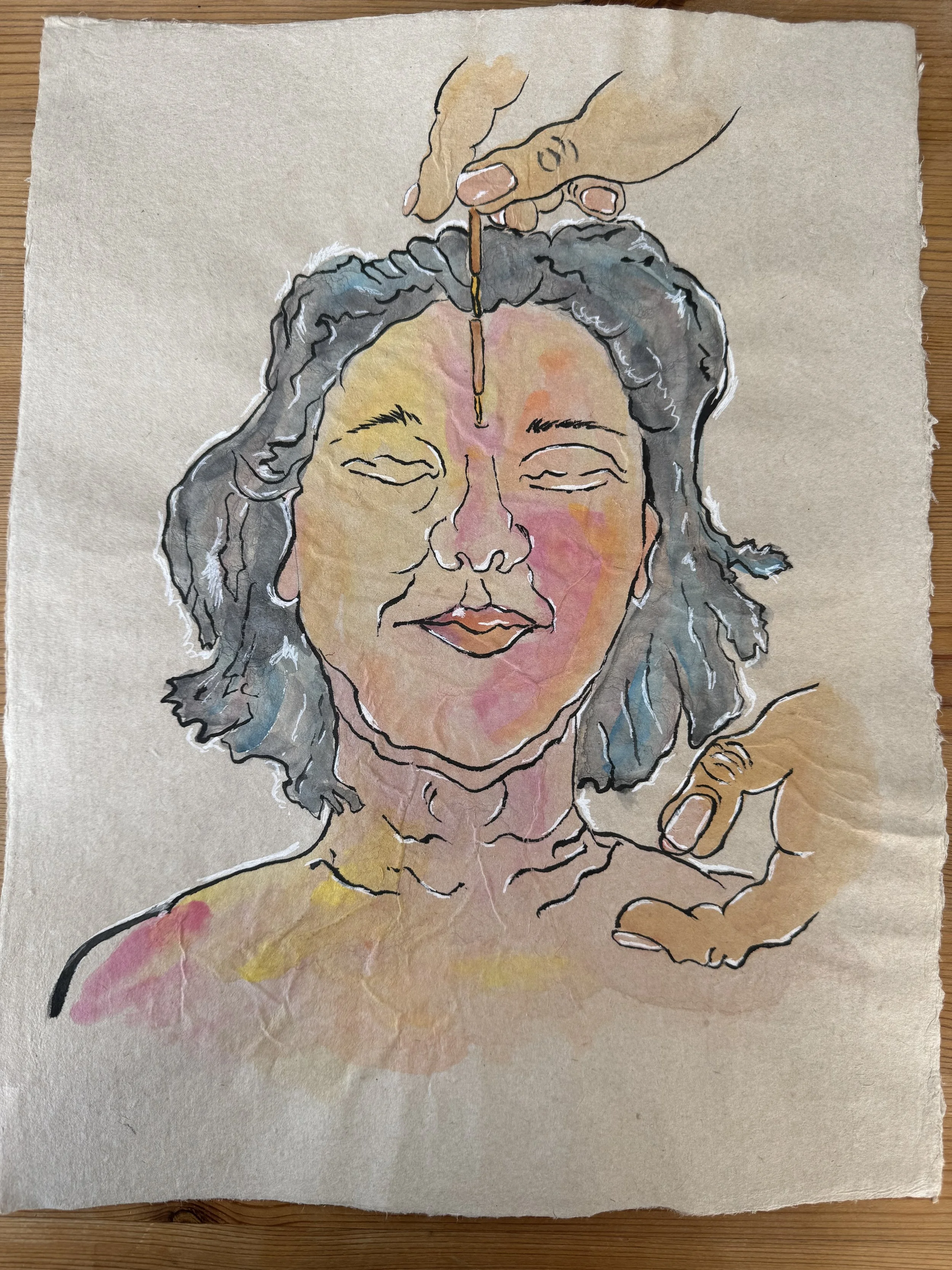 In ‘Adjustment’, the client is receiving treatment for their Yintang and DU-24. Yintang calms anxiety, worry, the spirit, and activates one’s intuition (or third eye), while the DU-24, among other benefits, can be used to calm anxiety and the mind. Karin Hạnh selected these points because they represent the belief of the unseen and metaphysical world (the mental, spiritual, and somatic worlds) as important to our health, wellness, and healing.