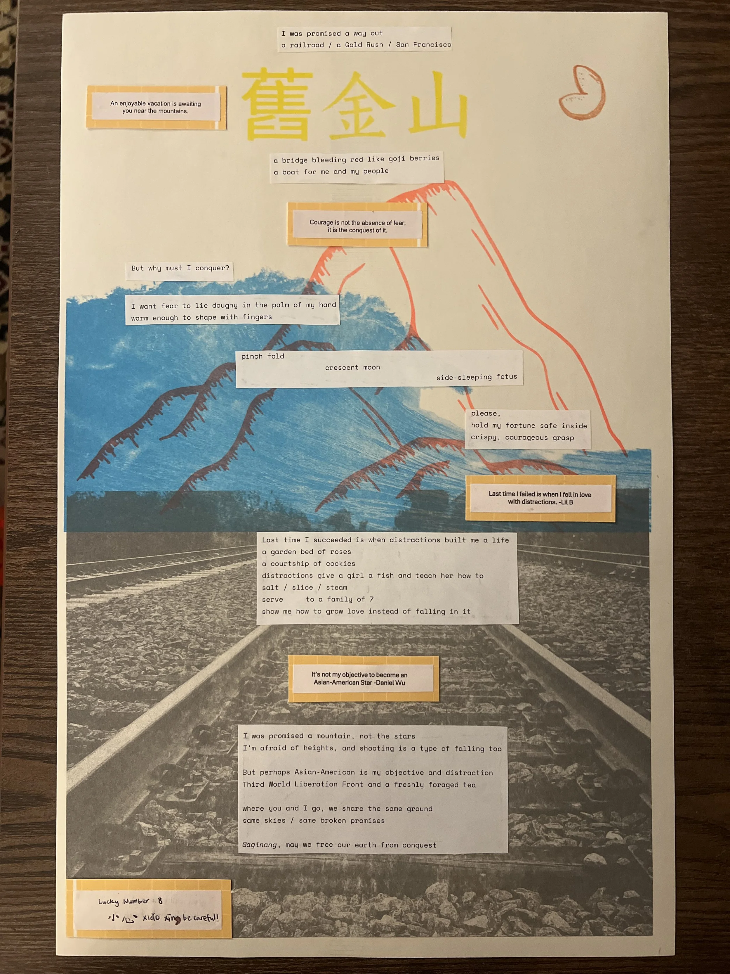 I am a spoken word poet, but wanted to challenge myself to bring words to life in a visual medium. This piece is the first tangible project I've completed in a long, long time. It consists of fortunes (yellow border) gathered from cookies I've eaten, including one I wrote myself! Being of Chinese (Teochew), Vietnamese, and Cambodian descent, I do a lot of thinking about the ways we preserve and recreate culture here overseas, both in lighthearted and heavy ways.