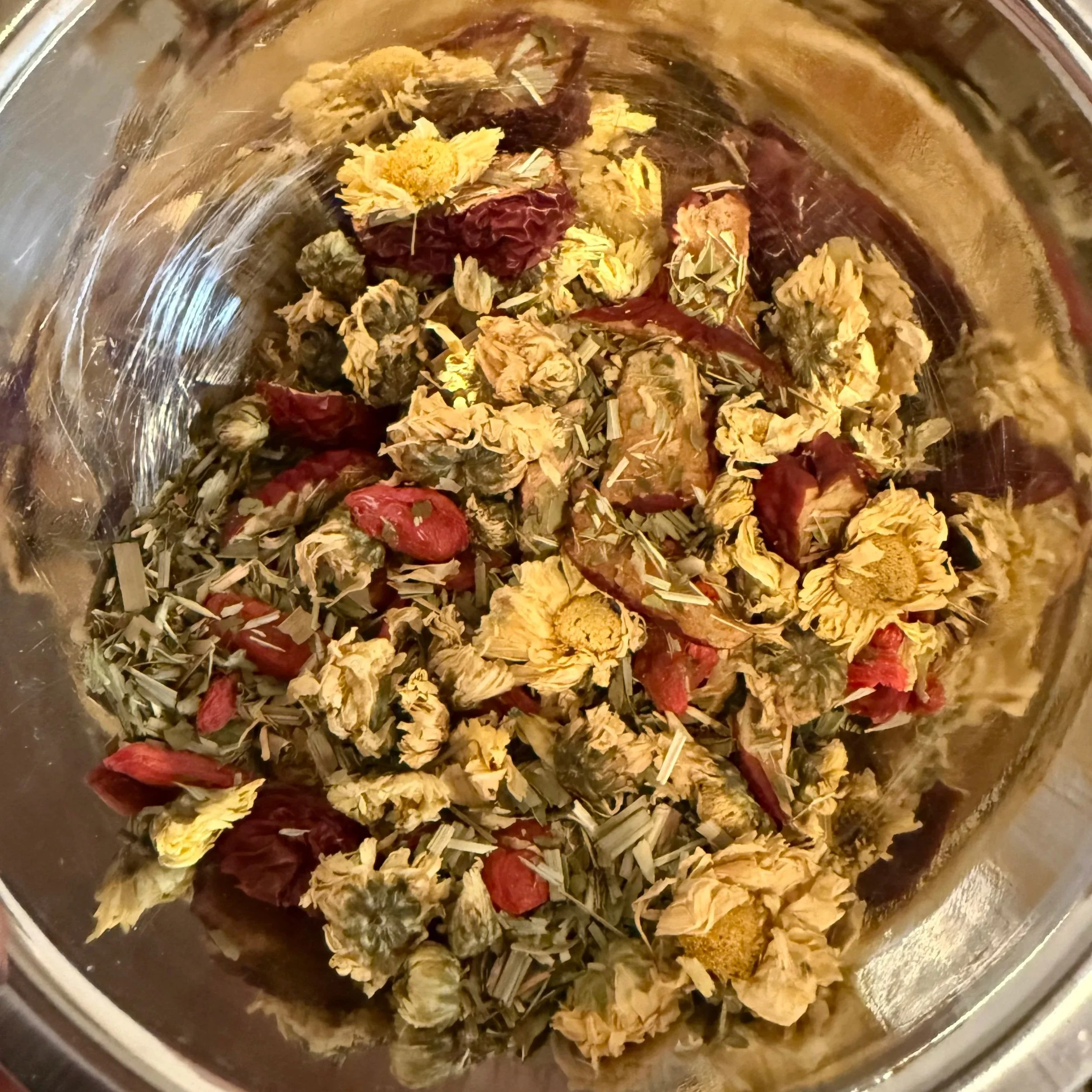 Chrysanthemum, Lemongrass, Peppermint, Jujube Date, Goji Berry, Oat Straw