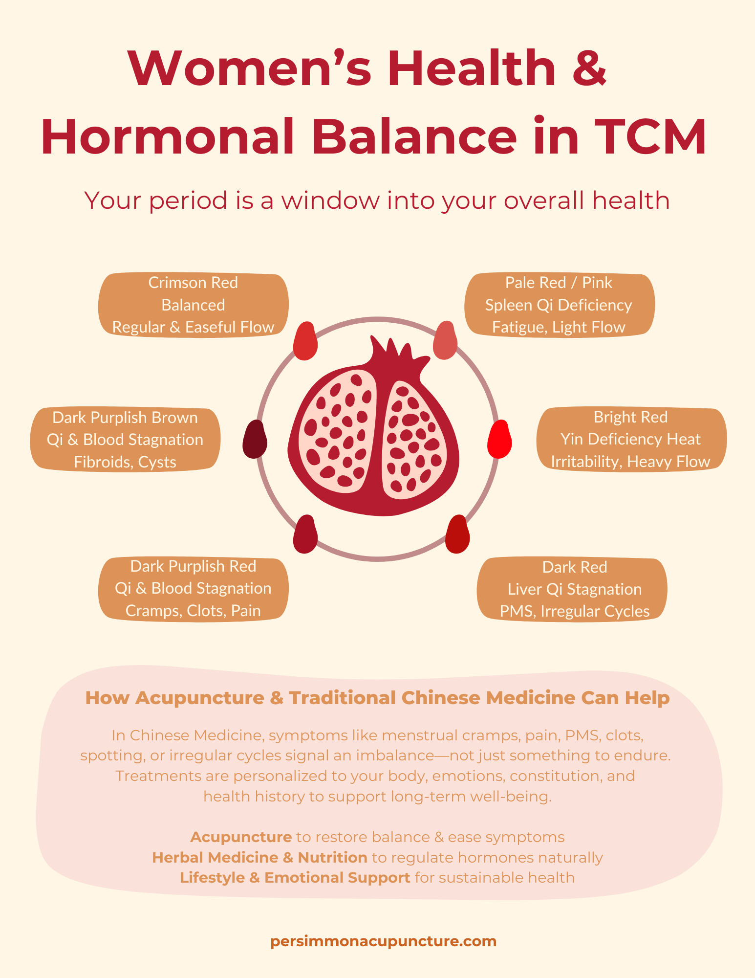 A visual guide to your menstrual cycle through TCM, connecting blood patterns, energetic balance, and emotional well-being. Learn simple acupressure techniques to relieve stress, support smooth Qi flow, and cultivate emotional balance.